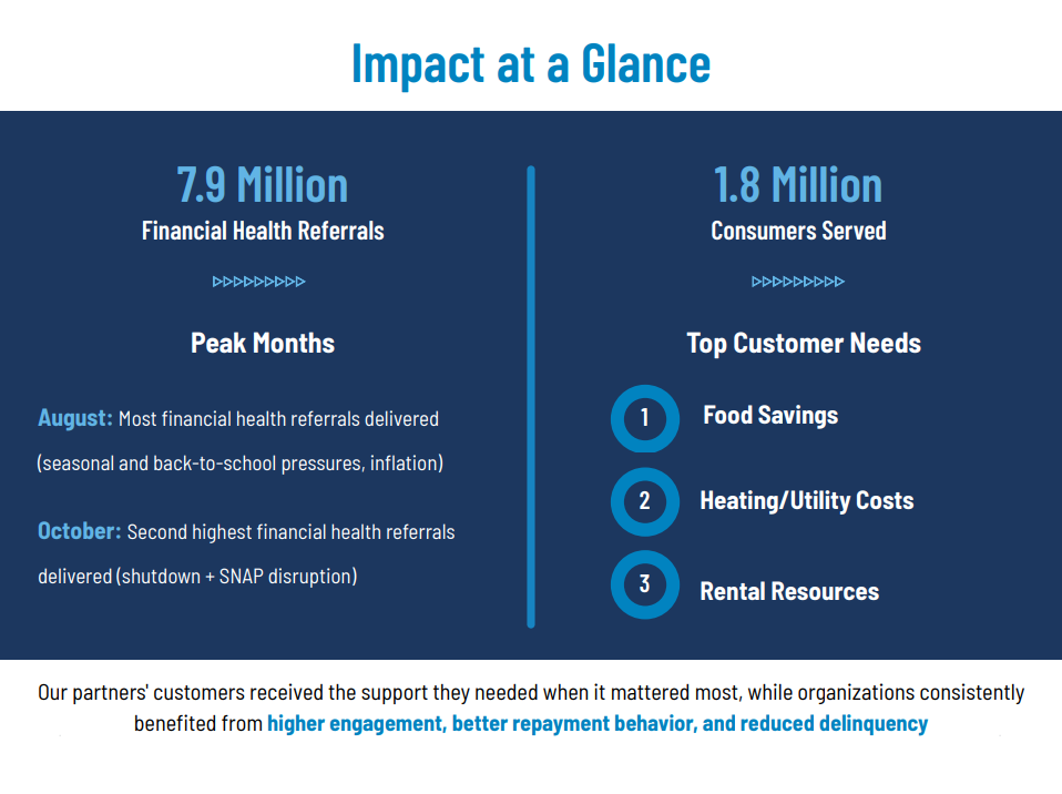 The impact is clear: 7.9 million financial health referrals delivered, 1.8 million consumers served, and real-time leadership and crisis response featured in The Hill, American Banker, Axios, and more. When economic pressures peaked in August and October, SpringFour and our partners met their customers exactly where they needed support and saw measurable business results because of it.