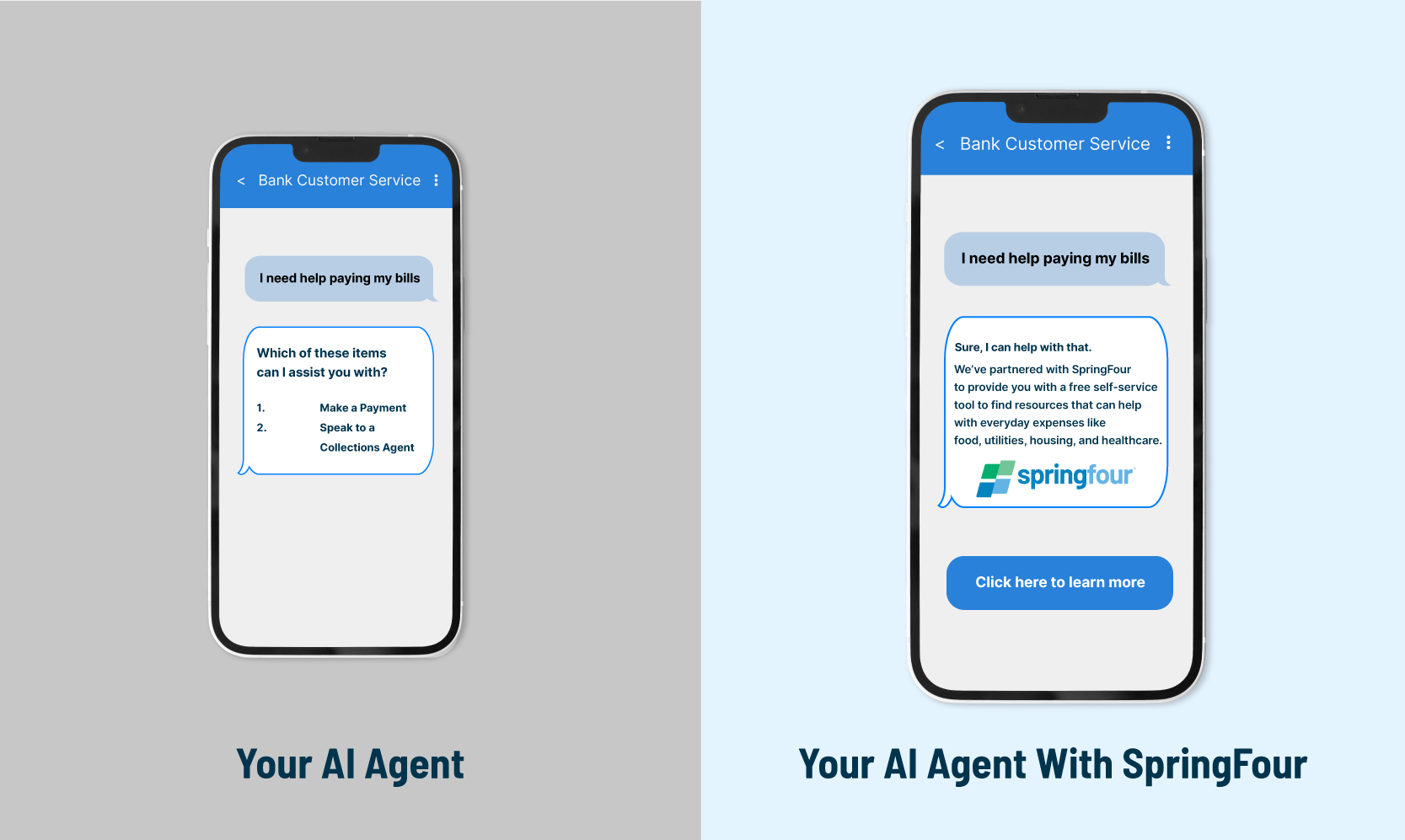 When embedded into AI, SpringFour’s digital tools instantly connect customers to relevant, vetted resources from trustworthy organizations, and they don’t get lost in a sea of generic advice, hallucinated content, dead ends, and unscrupulous actors. For teams, adopting SpringFour’s solution is decidedly low-risk, doable with very little tech support, no personal identifiable information (PII) required, and it can be deployed in fewer than 21 days.